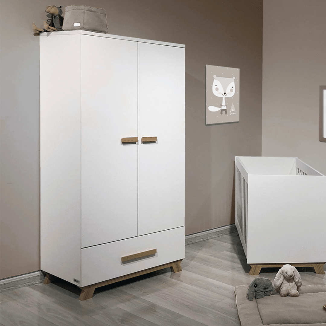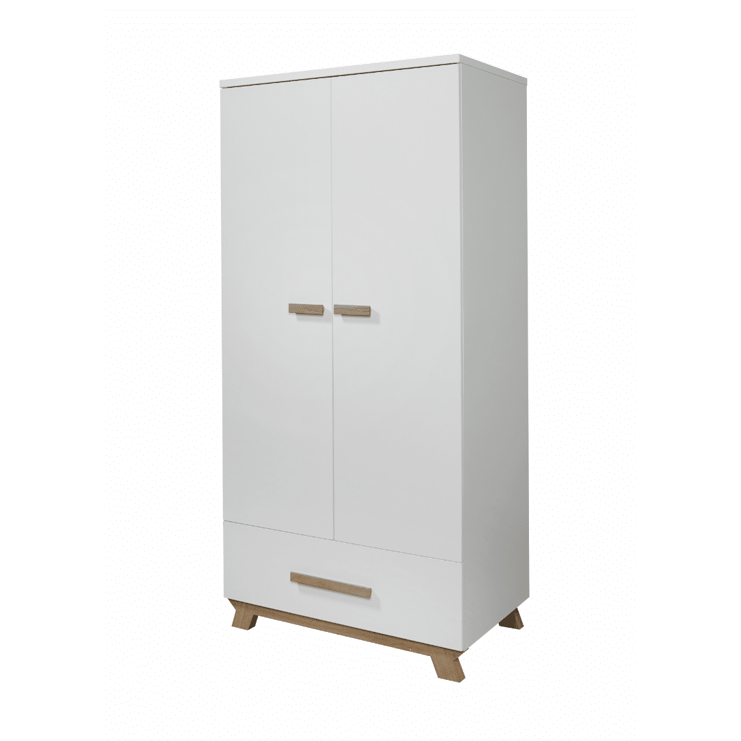Meuble en MDF avec un grand espace de rangement et un tiroir, doté de poignées et pieds en bois naturel.