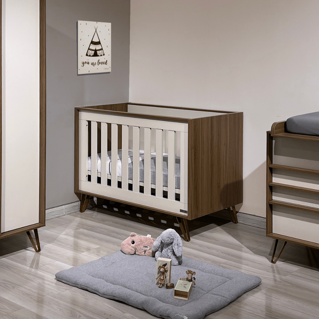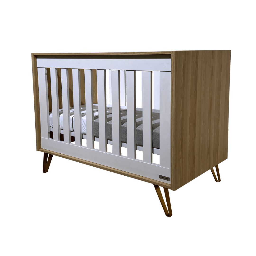 Lit bébé nordique 60×120 cm en MDF avec sommier à lattes réglable sur 3 hauteurs et côtés fixes.