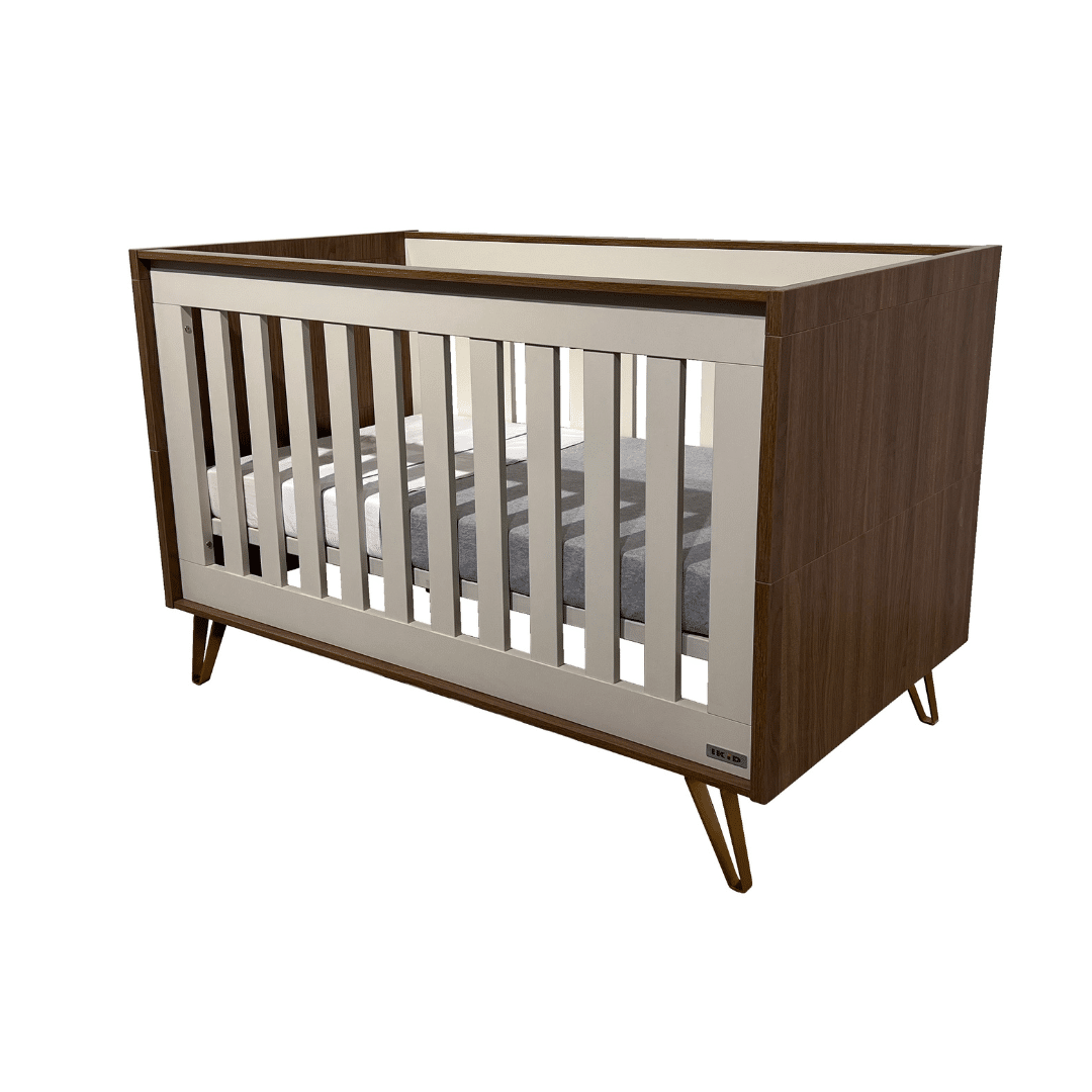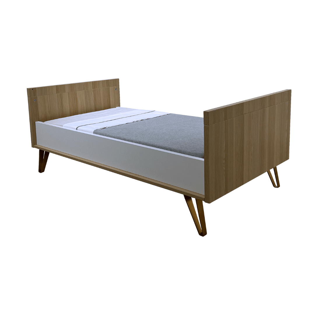 Lit bébé nordique 70×140 cm en MDF, avec sommier à lattes réglable sur 3 hauteurs et côtés fixes. Transformable en lit grâce au kit inclus.