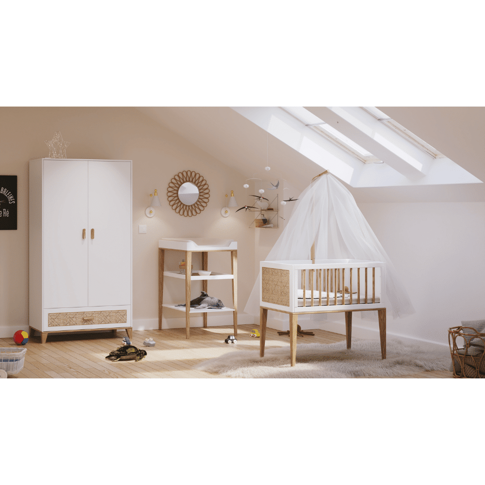 Robuste et totalement sécure, ce magnifique berceau durable et de haute qualité a été conçu à partir de rotin et de cèdre blanc. Ce qui vous garantit un mobilier léger, durable ainsi qu’un look bohème et intemporel. Coup de cœur assuré !