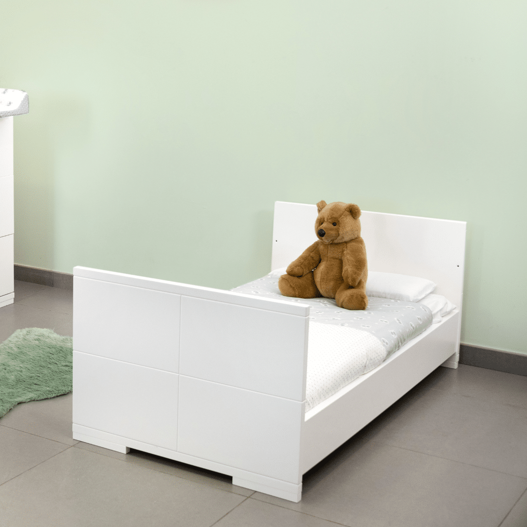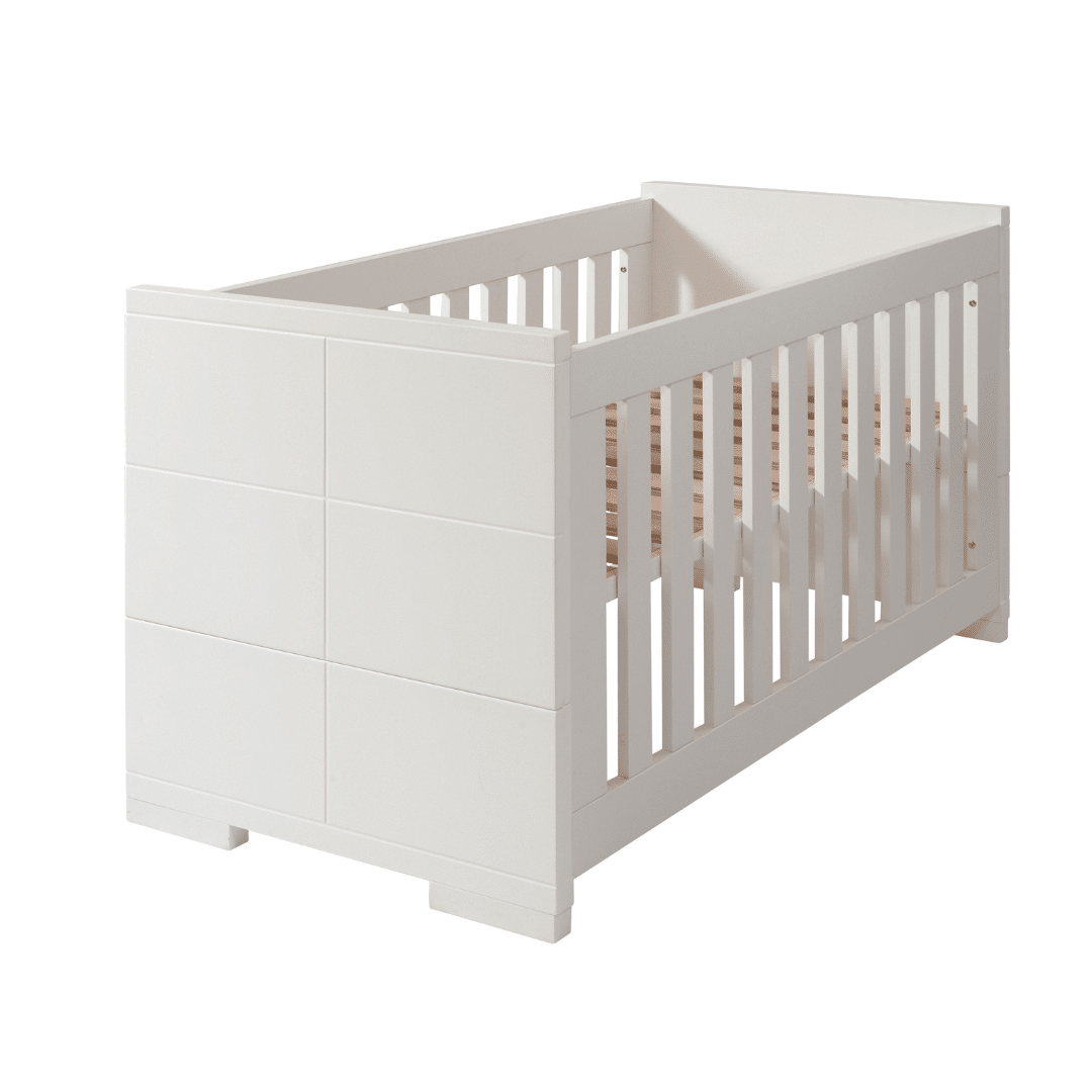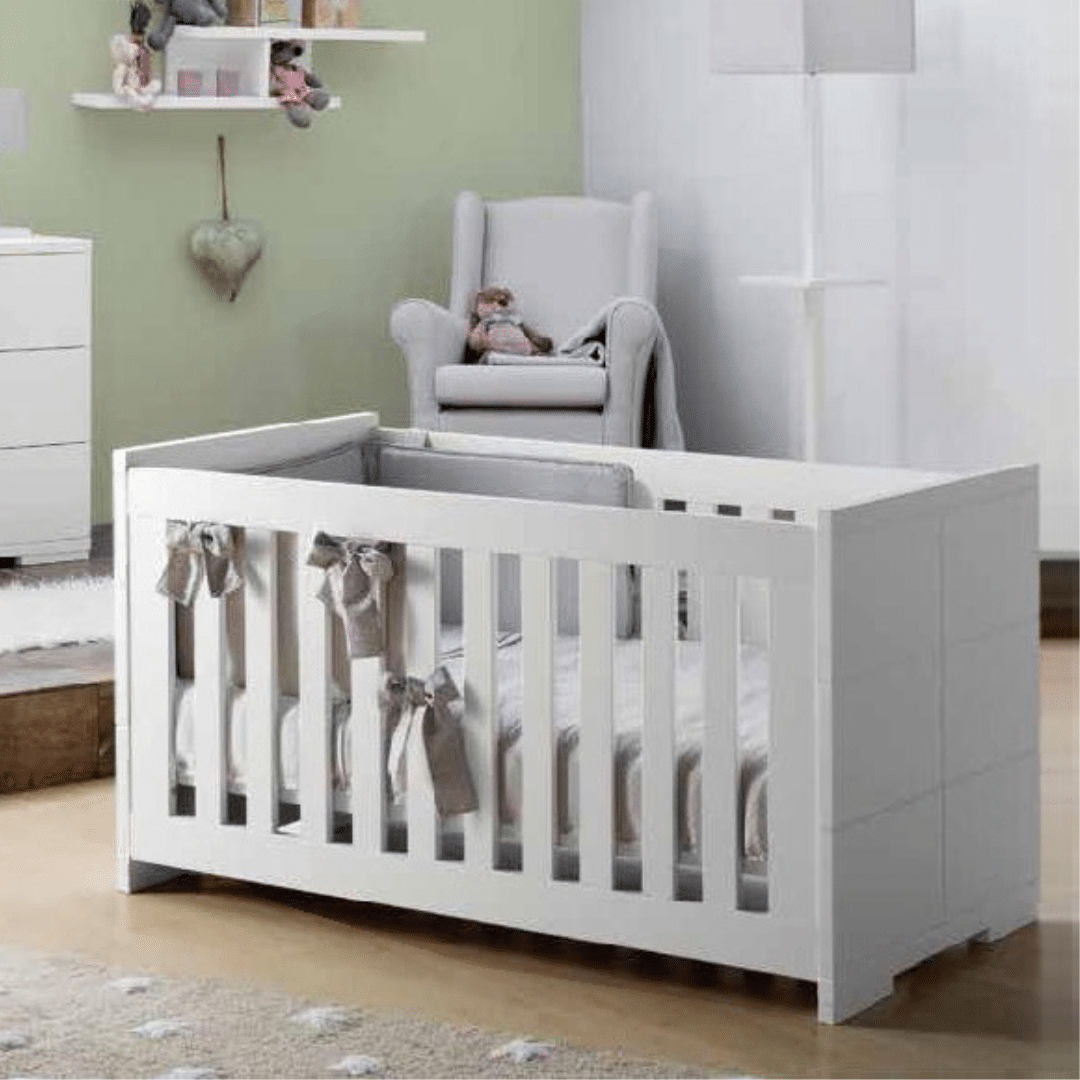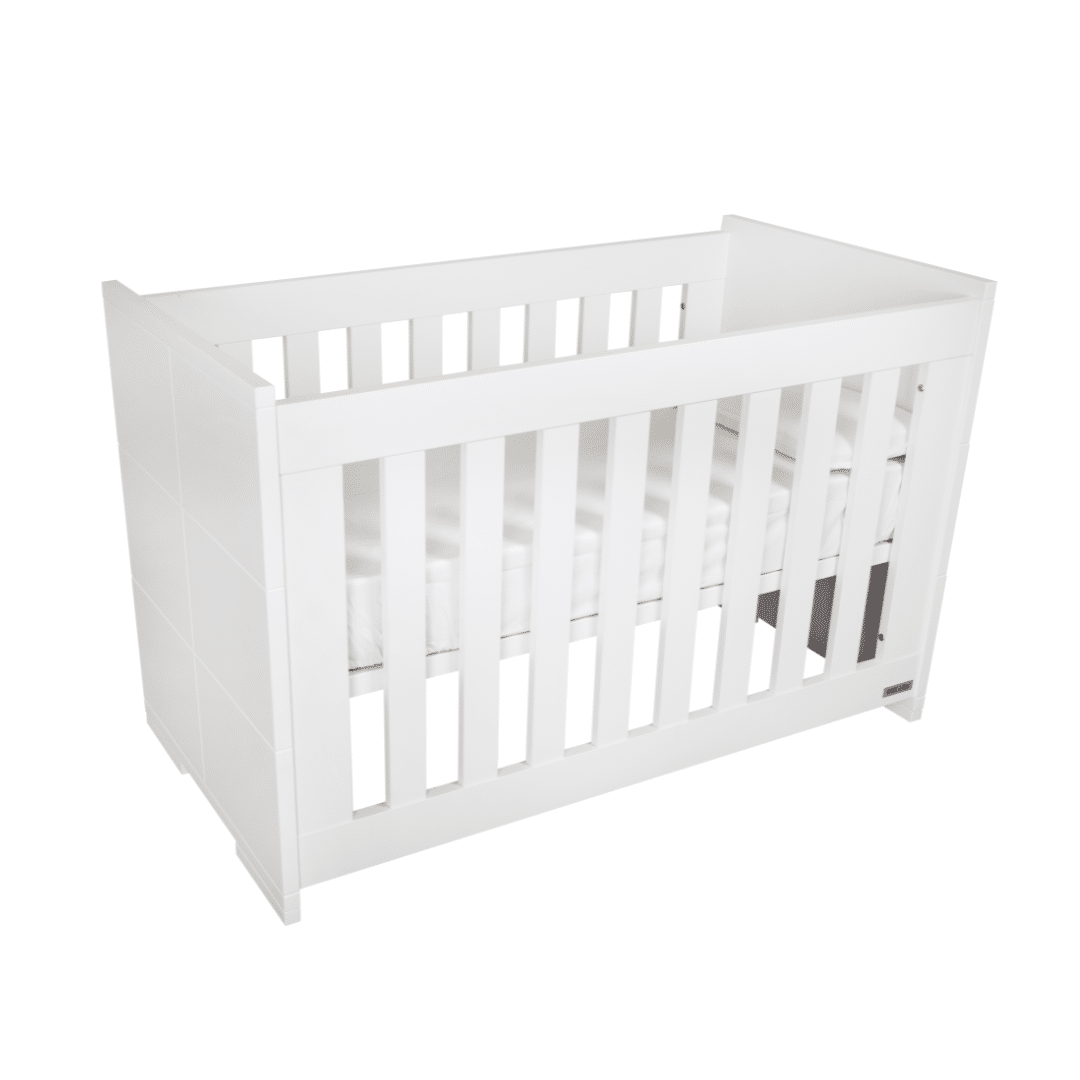 Lit bébé nordique en MDF pour matelas 60×120 cm, côtés fixes, sommier réglable sur 3 hauteurs avec lattes multiples.