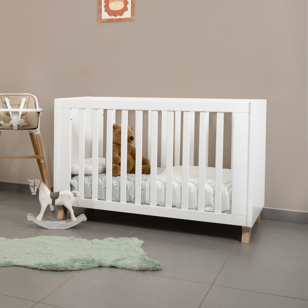 Lit bébé nordique 70×140 cm en MDF avec côtés fixes, sommier réglable sur 3 hauteurs et pieds en bois naturel. Évolutif en lit junior grâce au kit de transformation inclus.