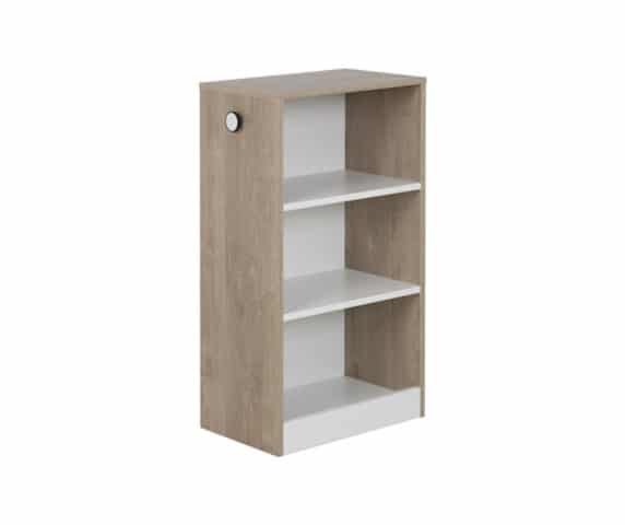 Les panneaux et les étagères de cette bibliothèque sont conçus en panneaux de particules de bois recouverts d’un papier de décoration imitant le chêne blond pour un effet bois naturel.