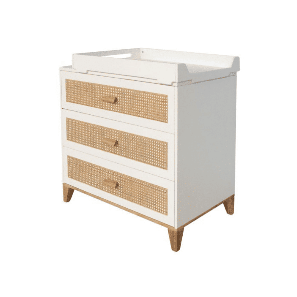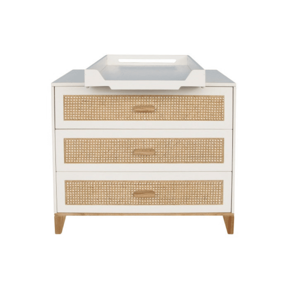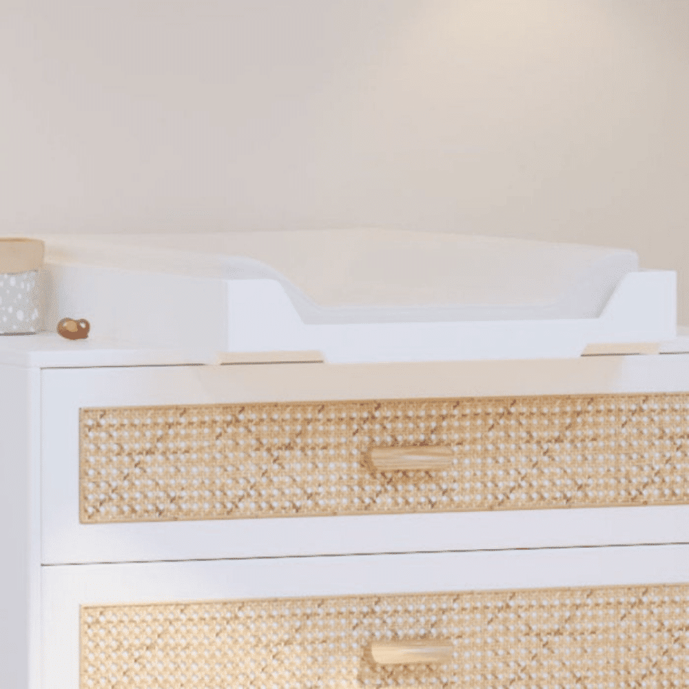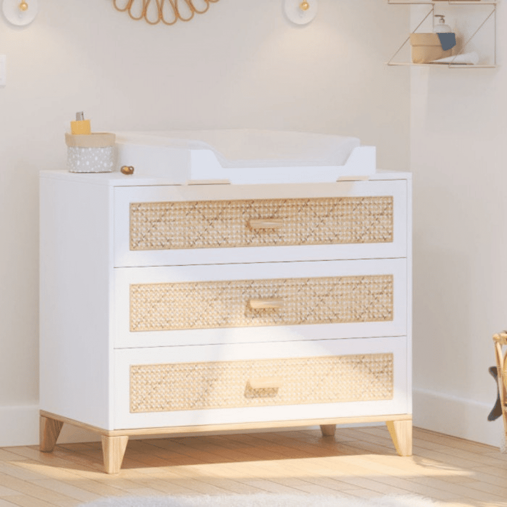 Fabriquée dans un mélange de bois et de rotin, le design de cette commode apportera à la chambre de votre tout-petit une touche délicate et naturelle !