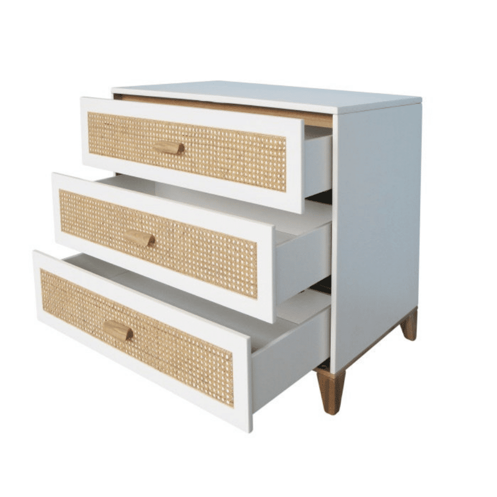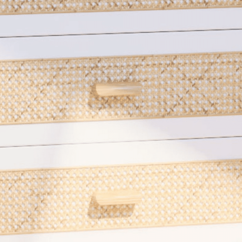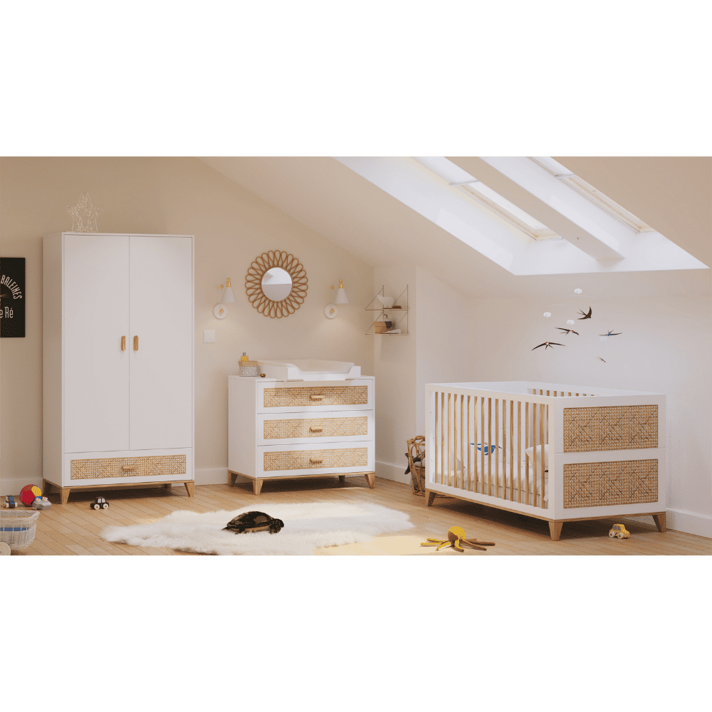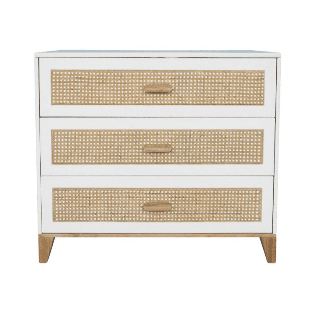 Fabriquée dans un mélange de bois et de rotin, le design de cette commode apportera à la chambre de votre tout-petit une touche délicate et naturelle !