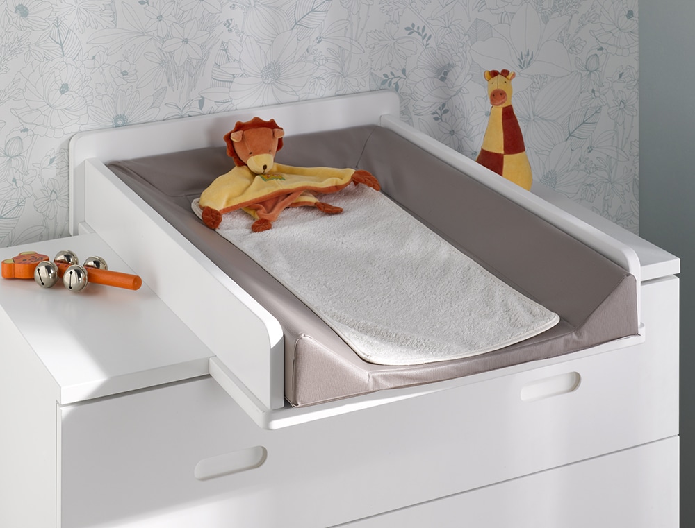 A la différence de la table à langer, le plan à langer est amovible. Véritable gain de place, le plan à langer « LOVINA » se fixe au-dessus de la commode de la même collection par des vis, pour assurer une plus grande stabilité à bébé. Cette fixation permet d’ouvrir le tiroir du dessous. Quand votre enfant aura grandit, vous pourrez enlever ce plan à langer très facilement, sans laisser de traces et conserver votre commode « LOVINA » pendant de nombreuses années.