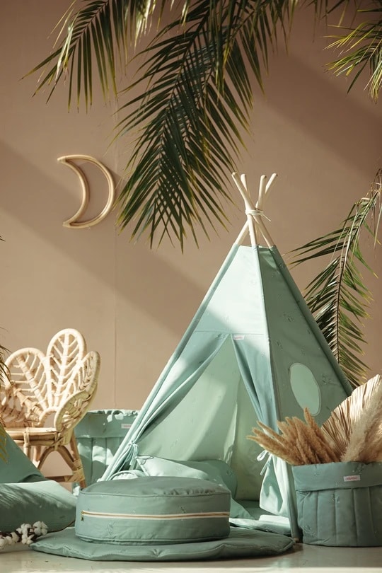 Révélant de délicats motifs printaniers, ce Pouf mise sur un Vert Mint chatoyant et apportera une touche de fraîcheur dans la chambre de votre enfant ! Posé à côté du tipi de la même collection, le Pouf Chic Vert Mint fera sensation !